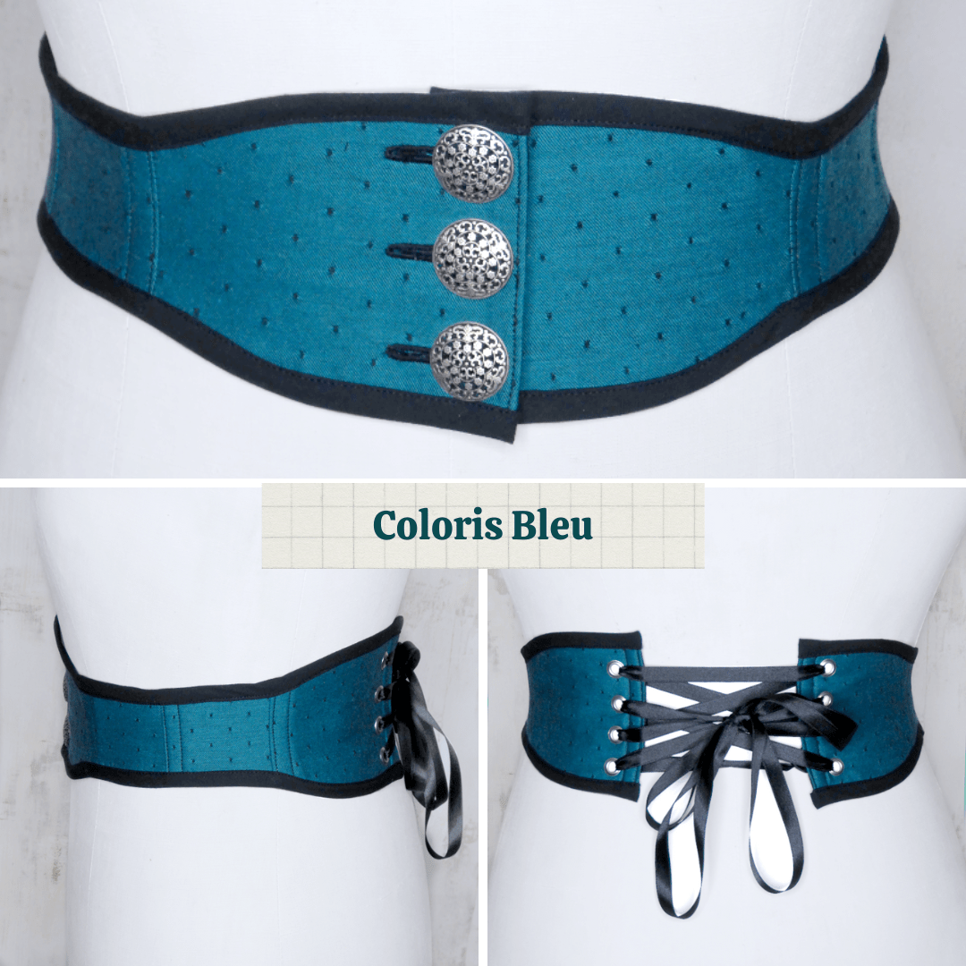 Ceinture corsetée esprit rétro, en coton labellisé bleu turquoise à pois noirs.