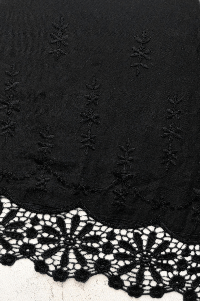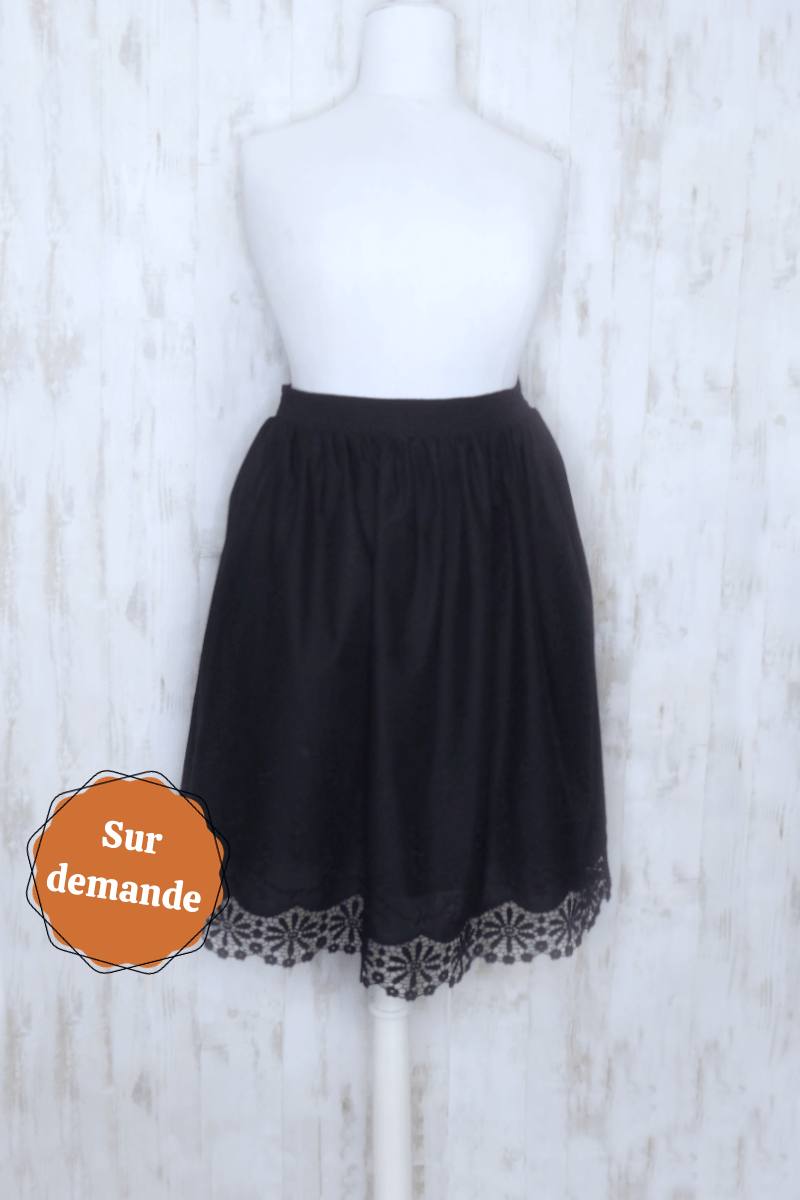 Jupe froncée en coton noir, ornée de broderies et de dentelle dans un esprit gothique et bohème.