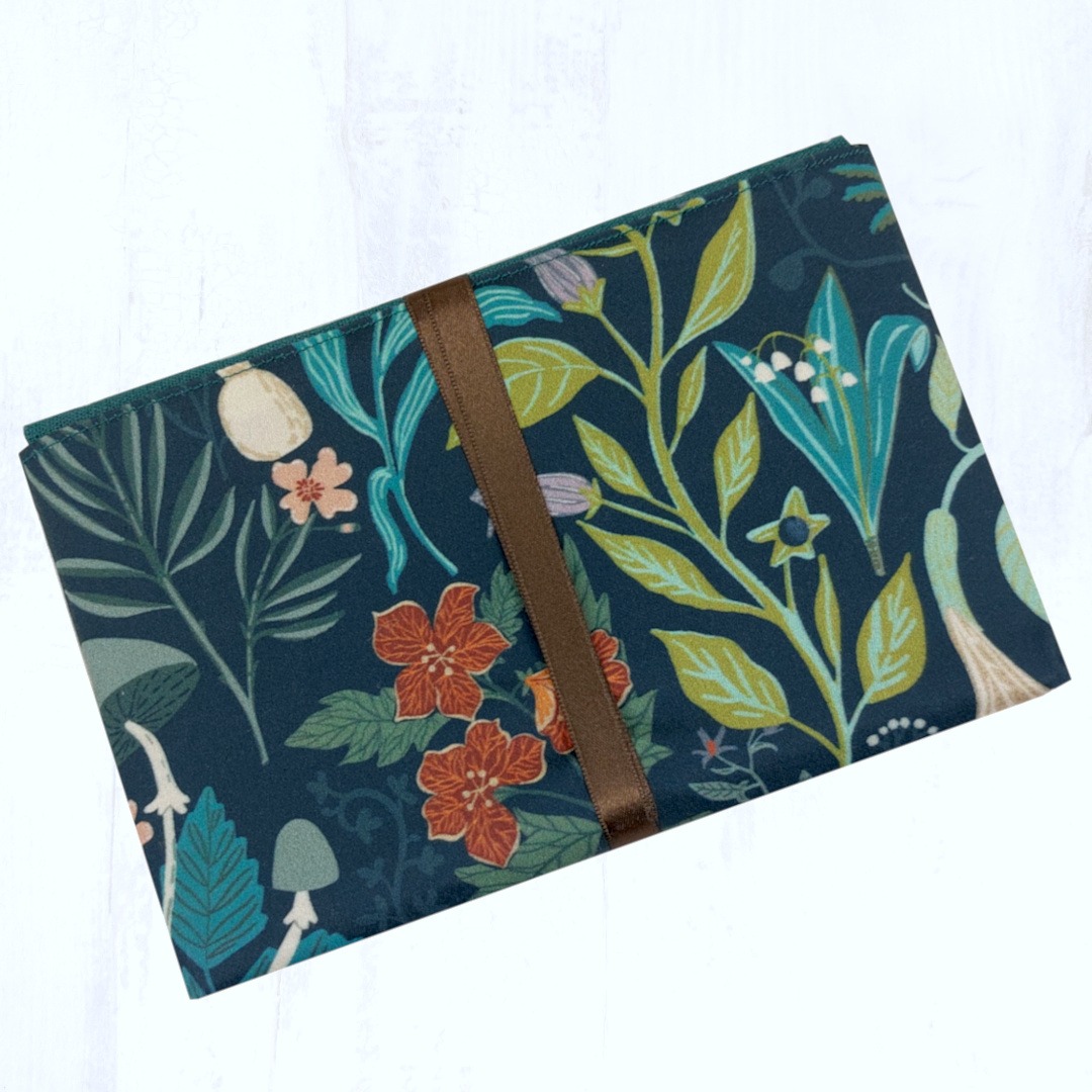 Pochettes à livre réalisées en lin et cotons à motifs issus des collections : Engrenages, Rituel, Bonbons, Sous-bois et Rossignol.
