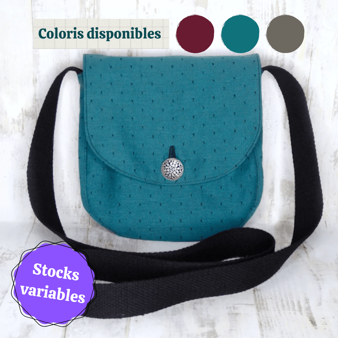 Sac à main esprit rétro, en coton bio à pois noirs, disponible en coloris bordeaux, turquoise ou marron glacé.